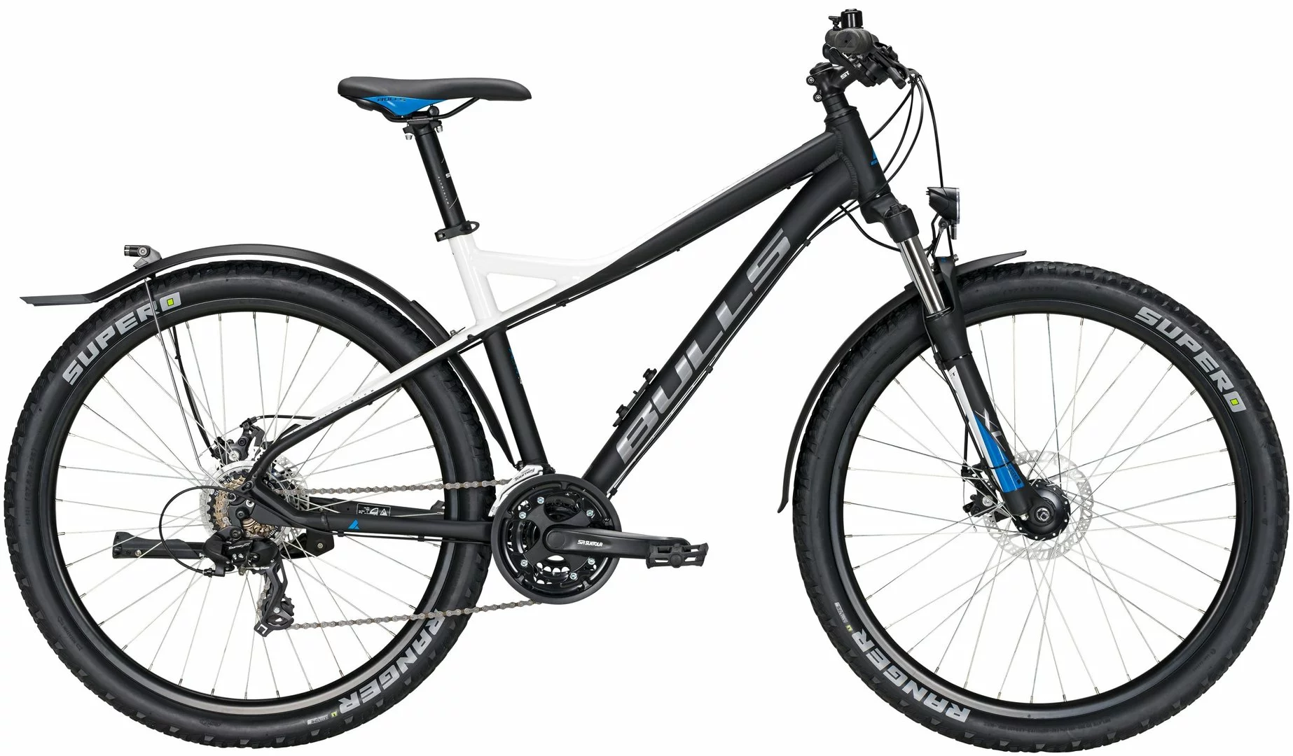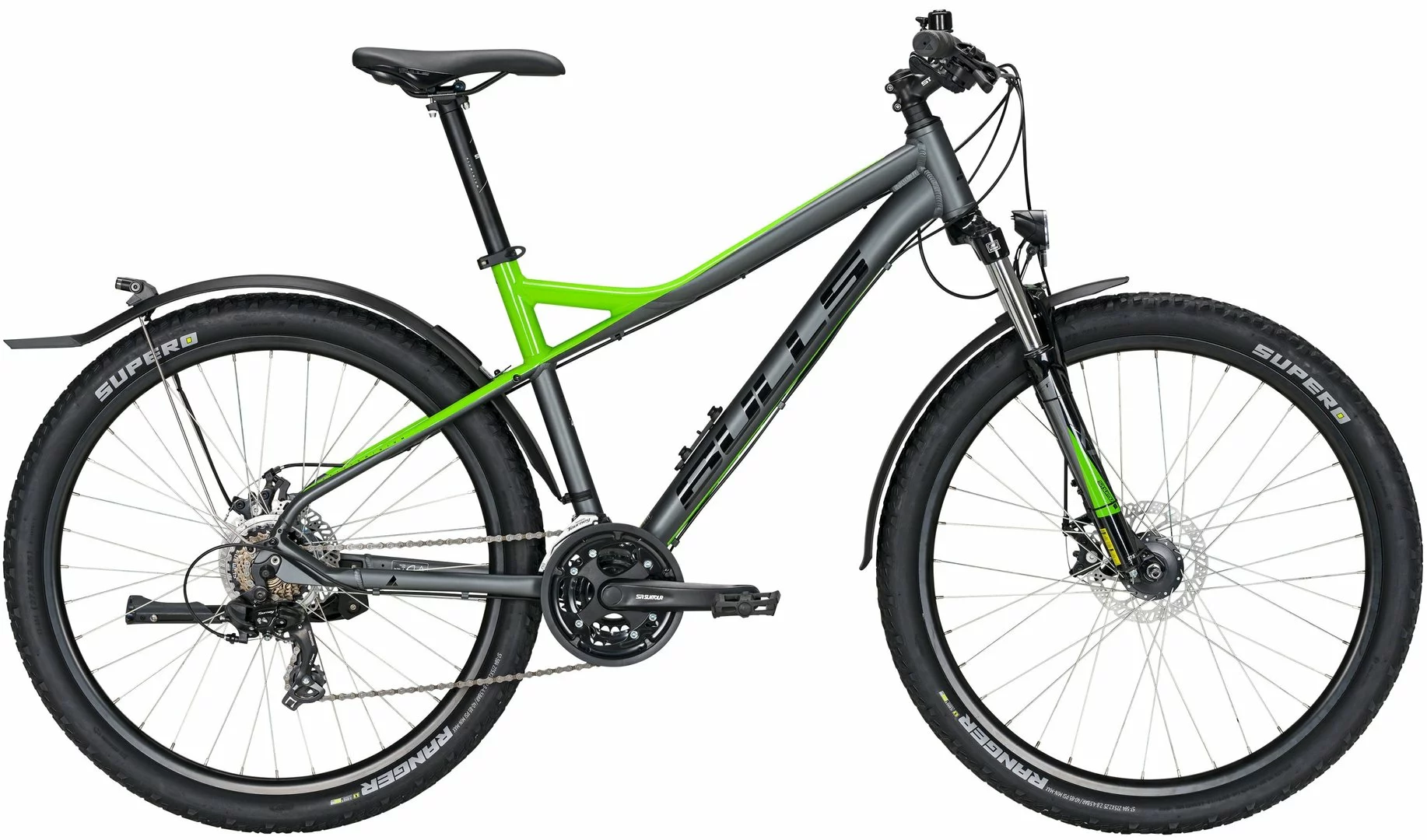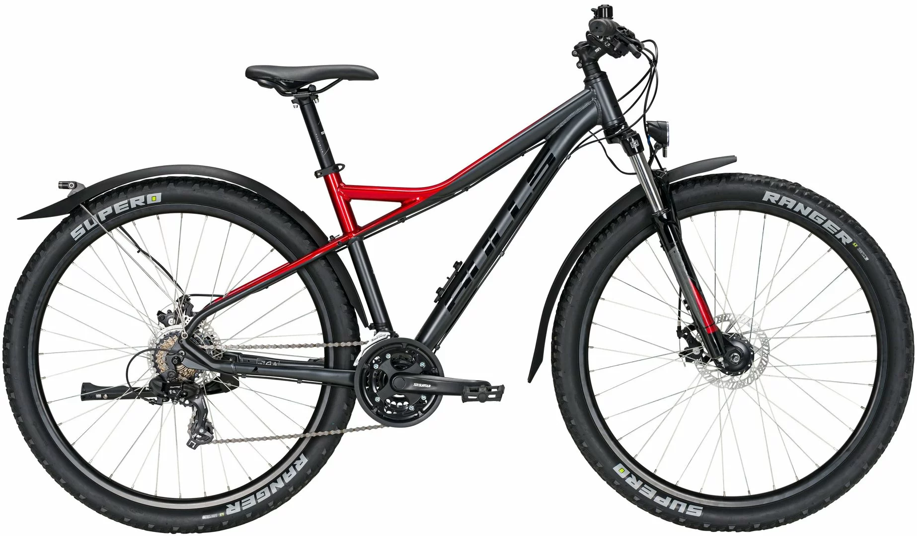 6061 Alu-Rahmen, Suntour XCT-D Federgabel einstellbar, 21-Gang Tourney Schaltung mit EZ-Fire Schalthebeln, Suntour XCC Kurbeln, Shimano Nabendynamo, DDM-2 Alu-Hohlkammerfelgen, Tektro MD-M280 Disc-Bremsen (160/160mm), STYX Sattelstütze, Downhill-Lenker und Vorbau, LED-Lampe, Standrücklicht, Ständer, Schutzbleche