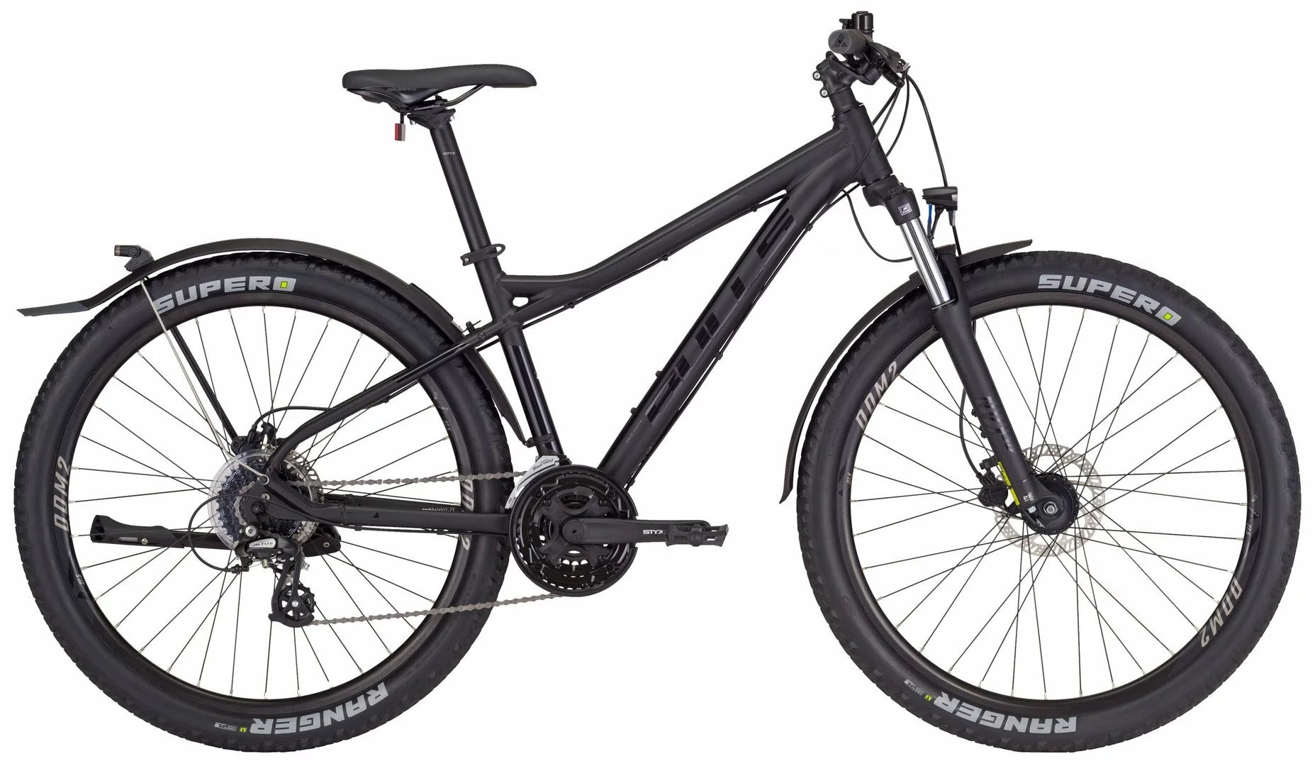 6061 Alu-Rahmen, Suntour NVX-30-DS Federgabel einstellbar, 24-Gang Altus Schaltung und Schalthebel, Tourney Umwerfer, STYX Kurbeln, Shimano Nabendynamo, DDM-2 Alu- Hohlkammerfelgen, Tektro HD-M275 hydraulische Disc-Bremsen (160/160mm), STYX Sattelstütze, Downhill-Lenker und Vorbau, 30 Lux LED-Lampe, Standrücklicht auf dem Schutzblech, verstellbarer Hinterbau-Ständer, Schutzbleche (hinten mit Strebe)