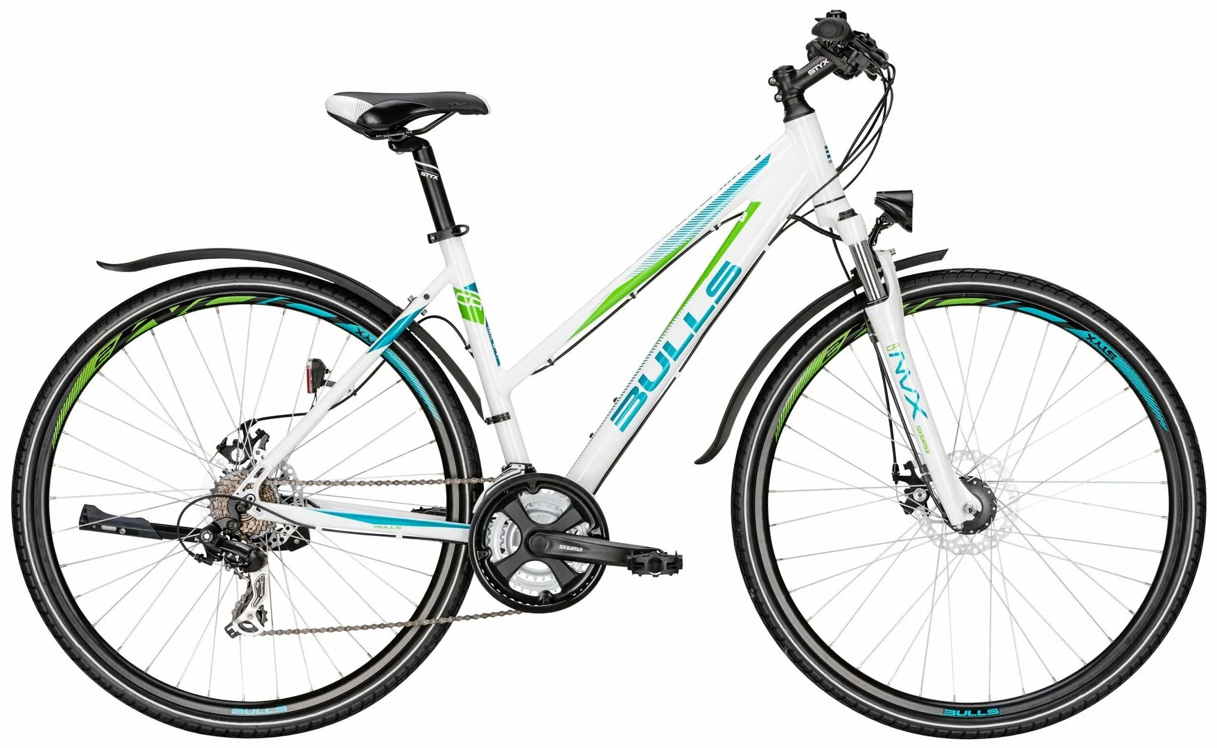 7005-Alu-Biaxial-Rahmen, Suntour NVX Federgabel, 21-Gang Shimano Tourney Schaltwerk und Umwerfer, EZ-Fire Schalthebel, Suntour Kurbeln, Tektro Aries Disc-Bremsen, Formula HR-Nabe, Alu-Felgen, Nabendynamo, LED-Lampe, Standrücklicht, Ständer, Steckbleche