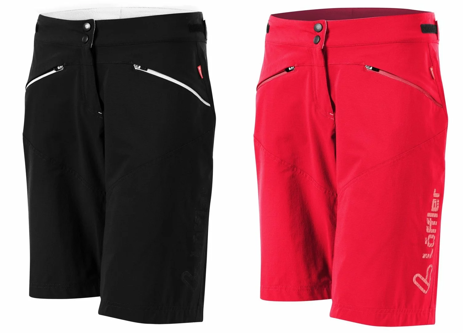 Leichte, elastische, schnell trocknende, wasser- und schmutzabweisende Damen-Radshorts aus einem 4-Wege-Stretchmaterial mit herausnehmbarer Elastic Rad-Innenhose, Bundweitenregulierung, 2 Reißverschluss-Eingrifftaschen, Reflektoren und dem Comfort Elastic Sitzpolster.