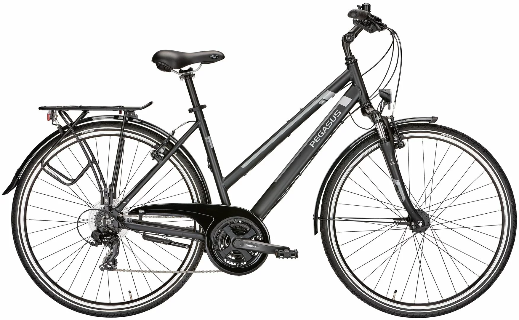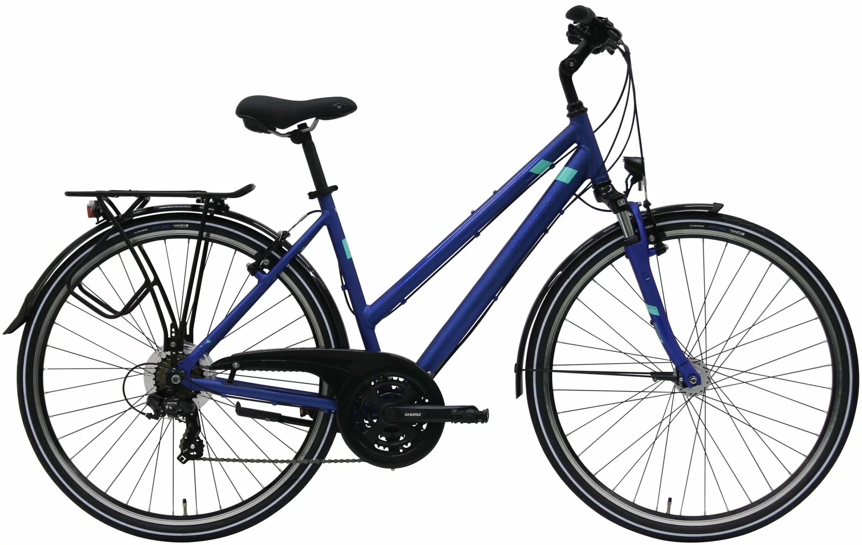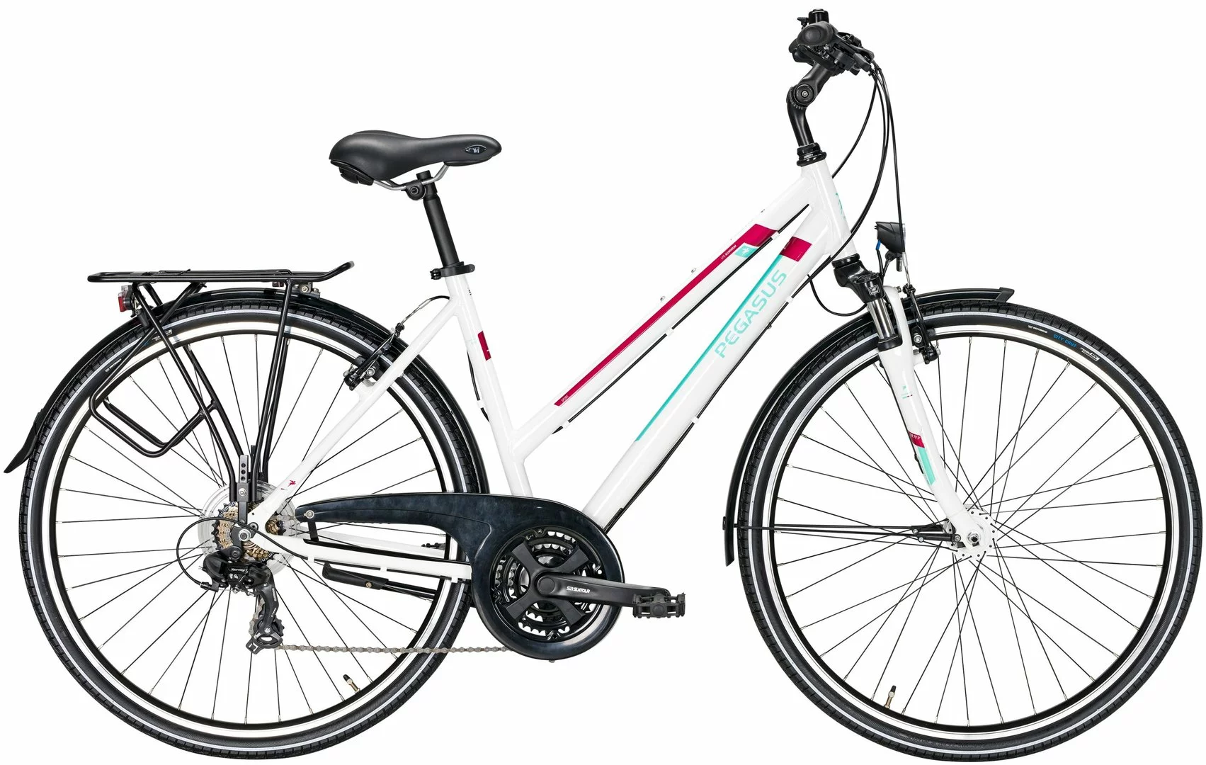 Alu Rahmen, Suntour CR-7V Federgabel, Shimano Tourney 21-Gang Schaltwerk und Umwerfer, Altus EZ-Fire, Suntour Kurbeln mit gekapseltem Lager, Alu V-Bremsen, Hohlkammer-Felgen, verstellbarer Vorbau, Nabendynamo, 15 Lux LED-Lampe, Standrücklicht, Kettenschutz