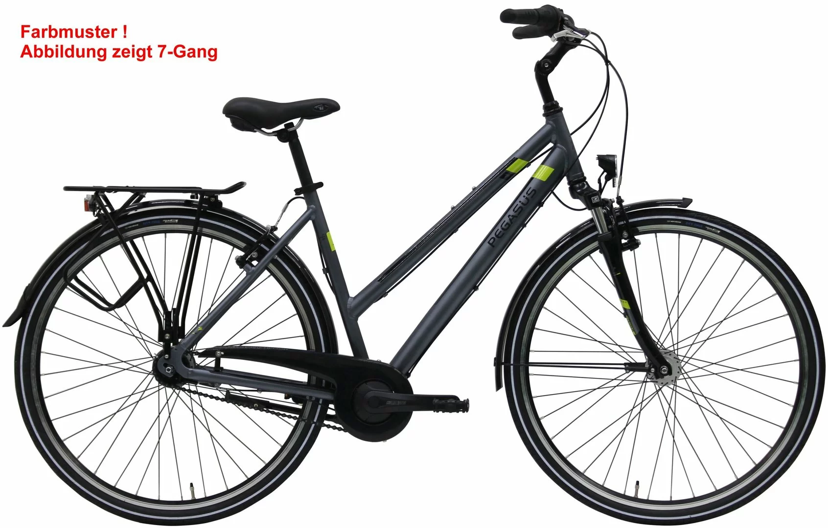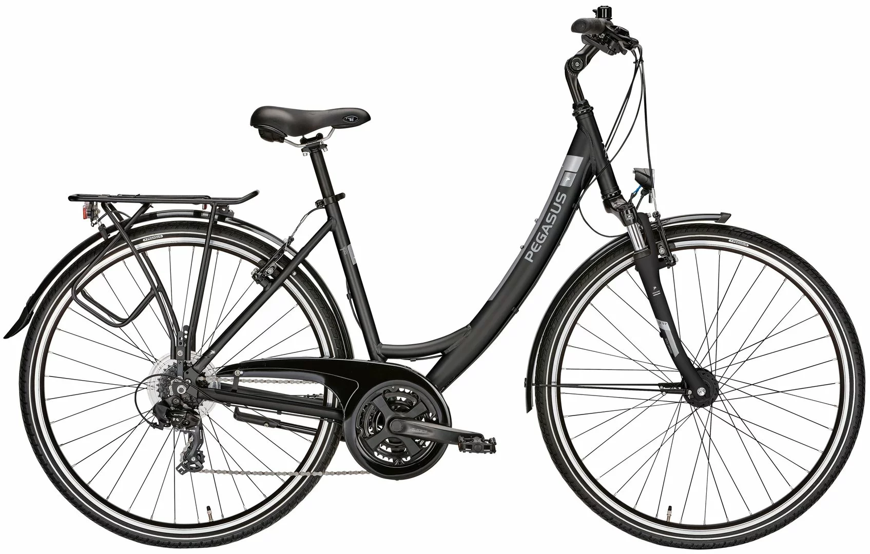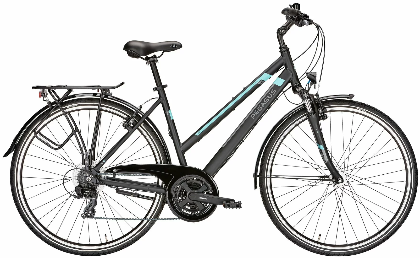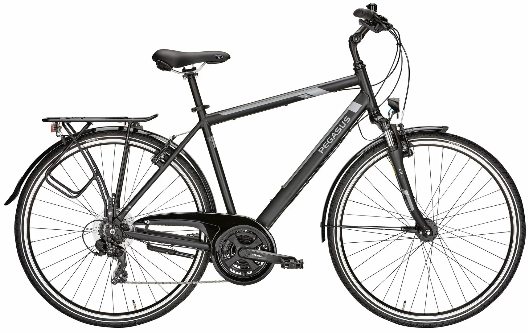 Alu Rahmen, Suntour CR-7V Federgabel, Shimano Tourney 21-Gang Schaltwerk und Umwerfer, Altus EZ-Fire, Suntour Kurbeln mit gekapseltem Lager, Alu V-Bremsen, Hohlkammer-Felgen, verstellbarer Vorbau, Nabendynamo, 15 Lux LED-Lampe, Standrücklicht, Kettenschutz