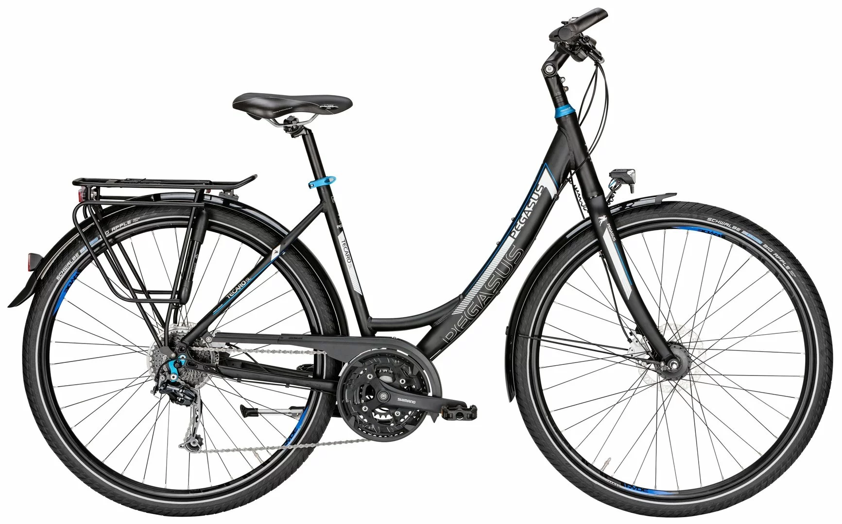 7005 Alu-Rahmen, Alu Starrgabel, Deore Schaltwerk, Altus Schalthebel und Umwerfer, Acera Kurbeln, Tektro Auriga Scheibenbremsen, Hohlkammer-Felgen, verstellbarer Vorbau, Fix-System Griffe mit Bar-Ends, Nabendynamo, LED-Lampe, Standlicht
