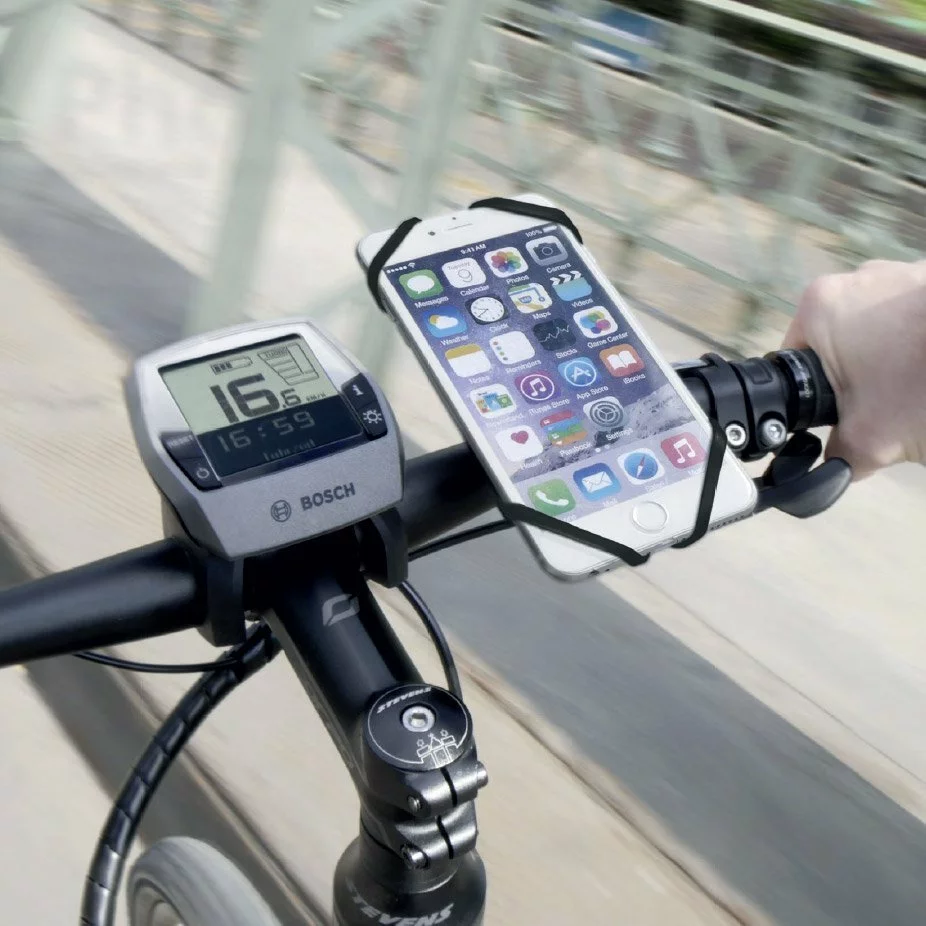 Die praktische PHONEPAD QUAD MINI Smartphone Halterung von KLICKfix mit neuem Quad Mini Adapter, großer Auflagefläche mit dämpfenden Gummipuffern und Silicon Stretch Bändern, erlaubt dir einen einfachen Wechsel von Hoch-auf Querformat.